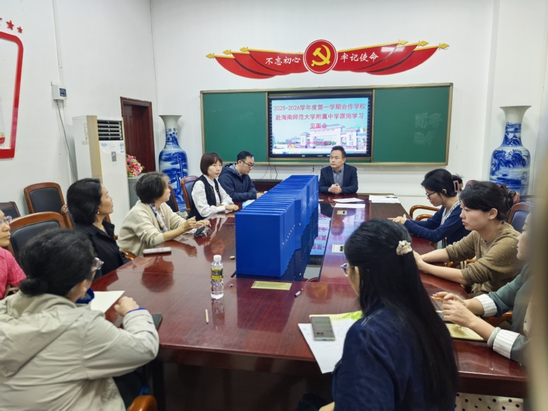 11月24日的见面会上,海师大附中教务科王波主任明确了跟岗学习的核心内容与具体要求。此次学习涵盖入校参观、学科组与备课组研讨、班级管理经验交流等多个维度,要求跟岗教师全时段跟班学习,并在学习末期完成公开课展示,确保学习成果落地。我部副主任赵欣欣在讲话中强调,海师大附中秉持先进教育理念,希望跟岗教师珍惜此次学习机会,在沉浸式体验中更新教育教学观念,重点关注“以学生为主体”的教学模式与AI赋能教育的创新实践。同时,他要求跟岗教师学成返校后充分发挥辐射带动作用,助力合作学校整体办学质量提升,并提醒大家注意个人安全,遇有问题及时与相关负责人沟通。